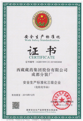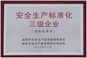 2017年4月取得成都市安全生產(chǎn)監(jiān)督管理局頒發(fā)的《安全生產(chǎn)標(biāo)準(zhǔn)化三級(jí)企業(yè)(危險(xiǎn)化學(xué)品)》證書(shū)和牌匾。