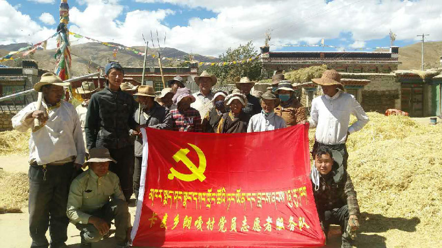 【隊(duì)長(zhǎng)桑珠及隊(duì)員與農(nóng)牧民群眾安裝打谷設(shè)備】 【卡麥鄉(xiāng)朗嘎村黨員志愿服務(wù)隊(duì)】