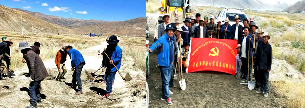 【隊(duì)長(zhǎng)尼瑪格桑及隊(duì)員與農(nóng)牧民群眾維修道路】 【卡麥鄉(xiāng)那吾村黨員志愿服務(wù)隊(duì)】