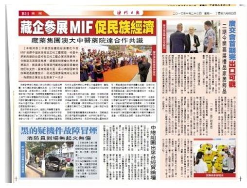 10月23日的澳門日?qǐng)?bào),以《藏企參展MIF促民族經(jīng)濟(jì)》進(jìn)行了報(bào)道。